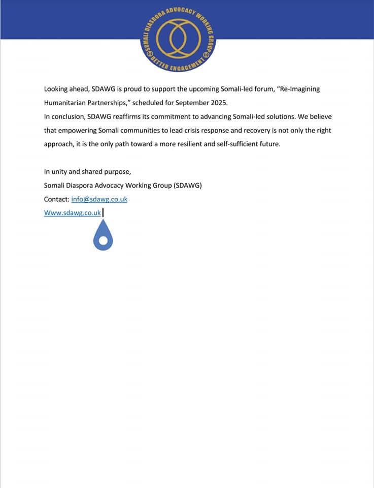 Looking ahead, SDAWG is proud to support the upcoming Somali-led forum, “Re-Imagining Humanitarian Partnerships,” scheduled for September 2025.