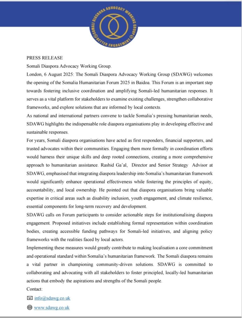 Somali Diaspora Advocacy Working Group welcomes the opening of the Somalia Humanitarian Forum 2025 in Baidoa. This Forum is an important step towards fostering inclusive coordination and amplifying Somali-led humanitarian responses. It serves as a vital platform for stakeholders to examine existing challenges, strengthen collaborative frameworks, and explore solutions that are informed by local contexts.